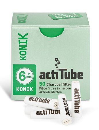 Especificaciones Técnicas de ActiTube Konik Fabricante: ActiTube Material del filtro: Carbón activo vegetal Diámetro: 6 mm en el extremo de la boca Longitud: 27 mm Formato: Pack 50 unidades