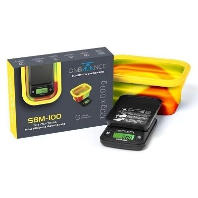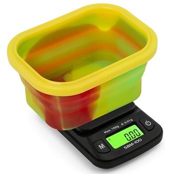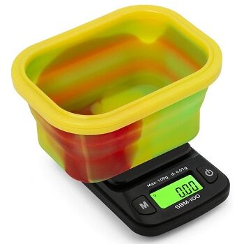 Báscula de precisión de bolsillo modelo SBM-100 con bol de silicona de colores Rasta, rango de peso desde 0.1 a 100gr., pantalla LCD retroiluminada de gran tamaño , gracias al práctico cuenco de silicona facilita el pesado de extraciónes y flores.
