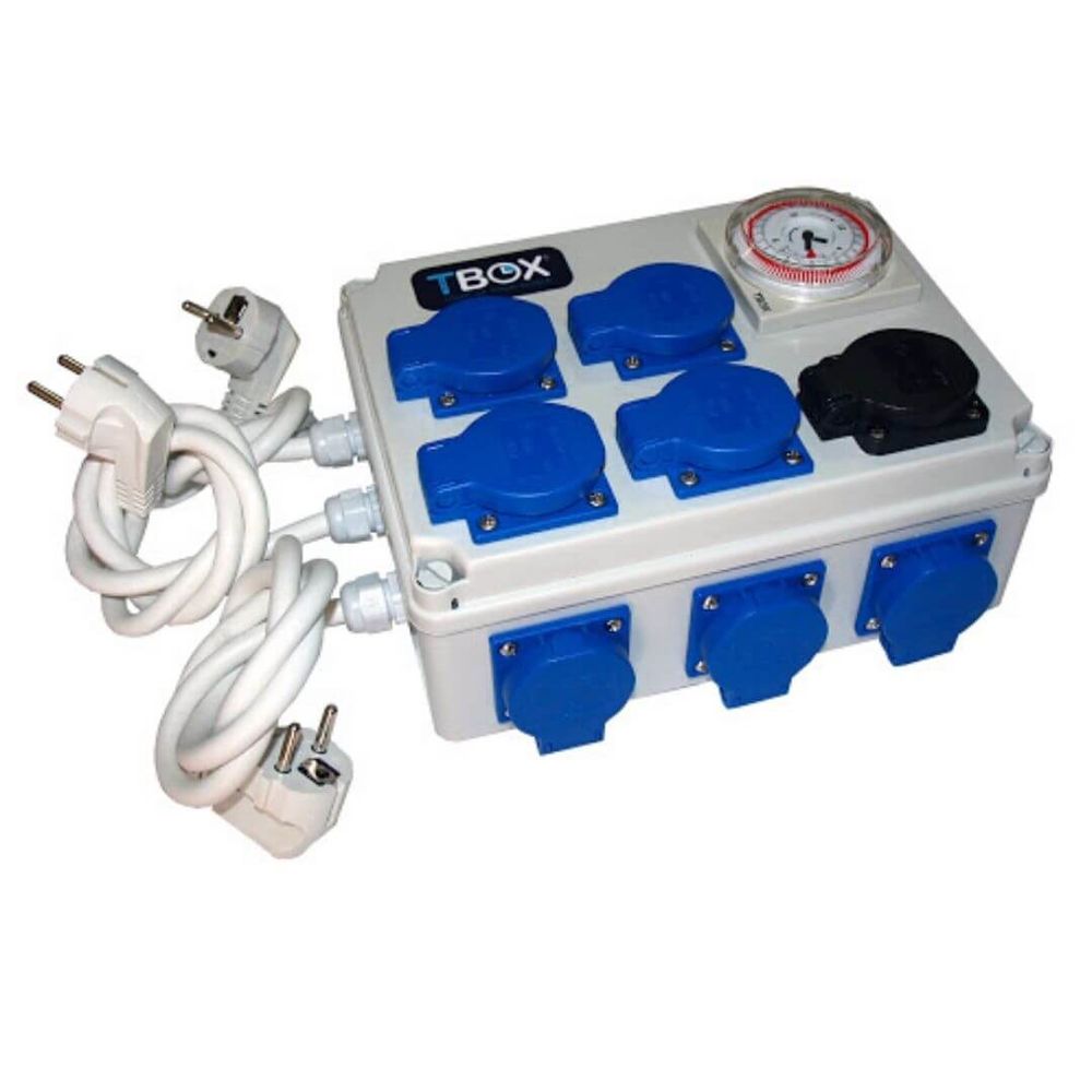 Las Tbox son cajas temporizadoras para conectar varias lámparas a un mismo temporizador y que todos los equipos de iluminación se enciendan y se apaguen a la vez, evitando problemas de que algún temporizador se quede encendido y las plantas no hagan bien las horas de oscuridad produciendo problemas sobre ellas.
